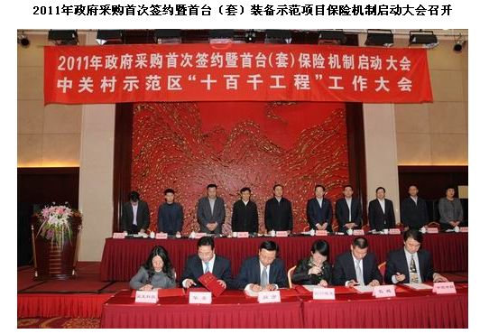 为更好地为企业开展技术创新和市场拓展保驾护航,有效地加快新技术新产品进入市场的步伐,2010年,中国保监会和中关村管委会积极探索,创新性地推出了首台(套)装备示范项目保险补偿机制。本次大会的召开,标志着政府采购首台(套)装备示范项目保险补偿机制正式启动实施。启动大会上,同方股份有限公司等4家中关村企业与保险机构签订了首台(套)重大技术装备示范项目保险合同,参保企业将得到政府给予的最高不超过80%的保费补贴。