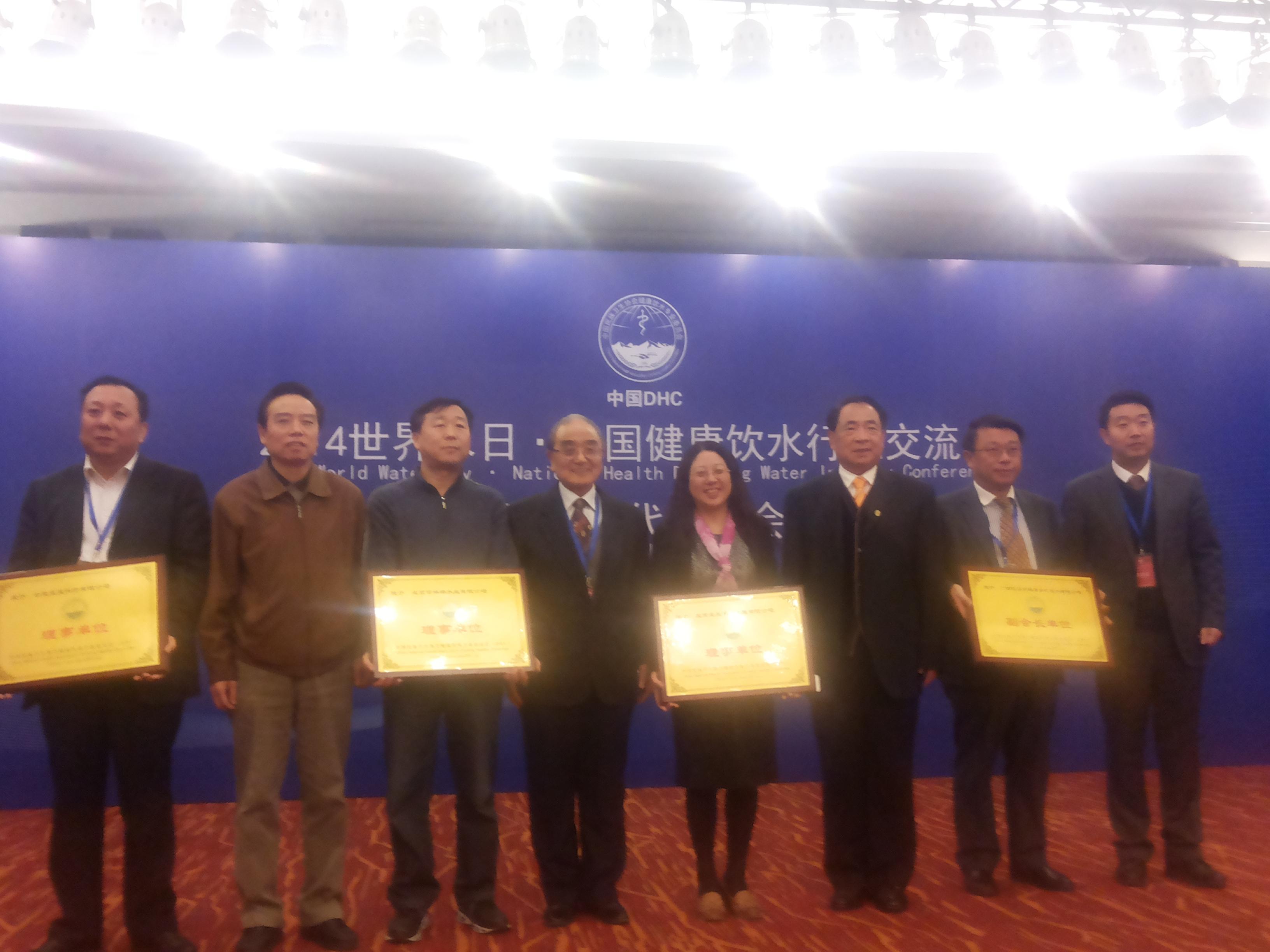 2014年3月22日,由中国民族卫生协会健康饮水专业委员会主办的2014世界水日—全国健康饮水行业交流会暨会员代表大会在北京世纪金源大饭店顺利召开。 会议开始时,首先由中国民族卫生协会常务副会长兼秘书长,原中纪委、监察部驻卫生医药部门纪检组 副组长、监察局局长郁德水致辞并发表讲话,并受民族卫生协会会长,全国政协常委、原国家民族事务委员会主任、中央统战部副部长李德洙的委托,带来了对本次会议顺利召开的祝贺。随后,健康饮水专业委员会会长金日光,秘书长马锦亚依次发表讲话,秘书长马锦亚还对健康饮水专业委员会2013年度的工作做出了工作总结及2014年度的工作报告。北京爱生科技发展有限公司作为健康饮水专业委员会的理事会员接受了协会授予的铜牌。张琼总经理代表爱生公司上台领奖并与协会领导合影留念。