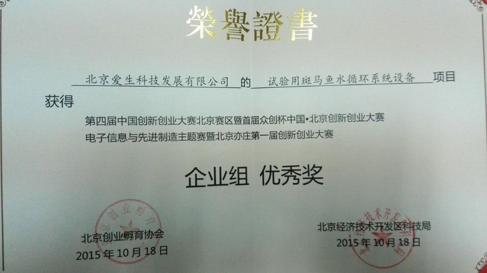 爱生科技的参赛项目试验用斑马鱼水循环系统经过海选、初赛、复赛等环节,获得了本届创新创业大赛的企业组优秀奖,爱生战略部经理周菁楠出席颁奖典礼。