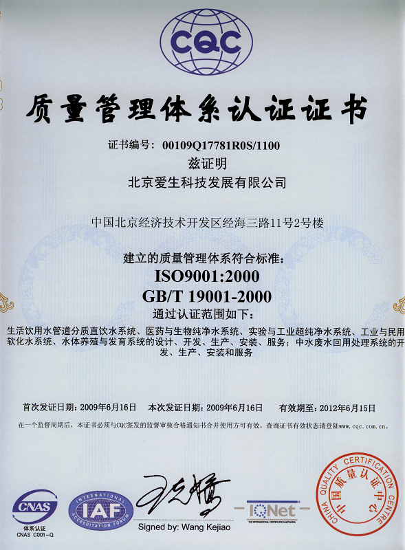 为了加强企业管理,保证产品质量,控制环境影响,为顾客提供满意的产品,爱生公司于2002年开始就在行业内率先引进ISO标准化管理思路,对企业产品质量与环境影响的控制和具体执行进行了全方面的标准化设计,按ISO9001和ISO14001质量和环境管理体系标准进行文件规范,推行制度化、标准化、规范化管理模式。同年爱生科技成为北京净水处理行业第一家通过了以严格著称的中国新时代质量认证中心(XQC)的质量和环境管理体系双认证。